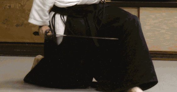 When doing the first chiburi in Inyoshintai(also known as Eishin ryu chiburi or Suhei noto[horizontal or level] chiburi), it is important to keep the blade edge to the right and the tip slightly lower than the hand so that a drop of water/blood could roll down the slope. If executing Suhei noto chiburi, one should keep the sword parallel to the ground. Regardless of chiburi style, the tip of the blade should always be pointed forward. The right hand should be in line with the right leg, and the feeling with the right hand, and its extension the tip, is pressing down. Keep training!